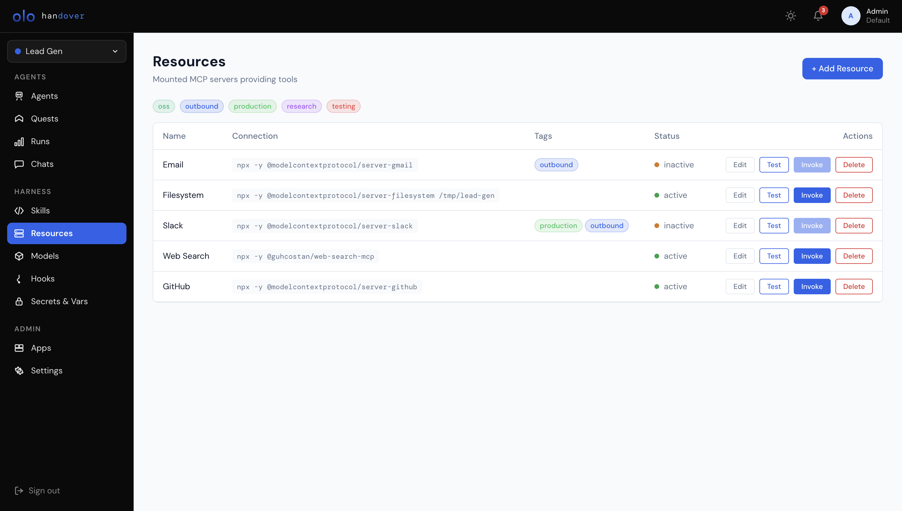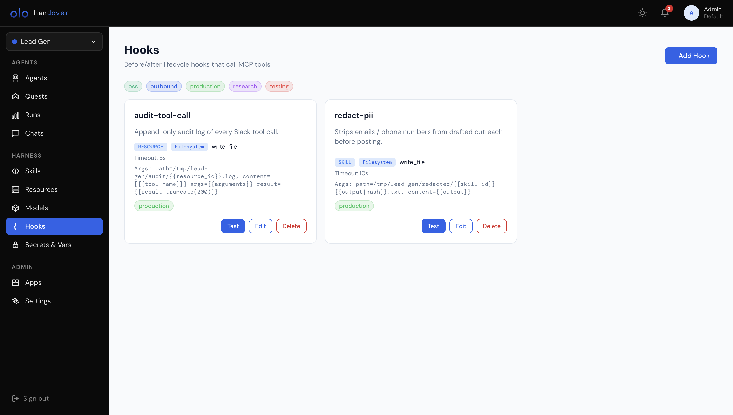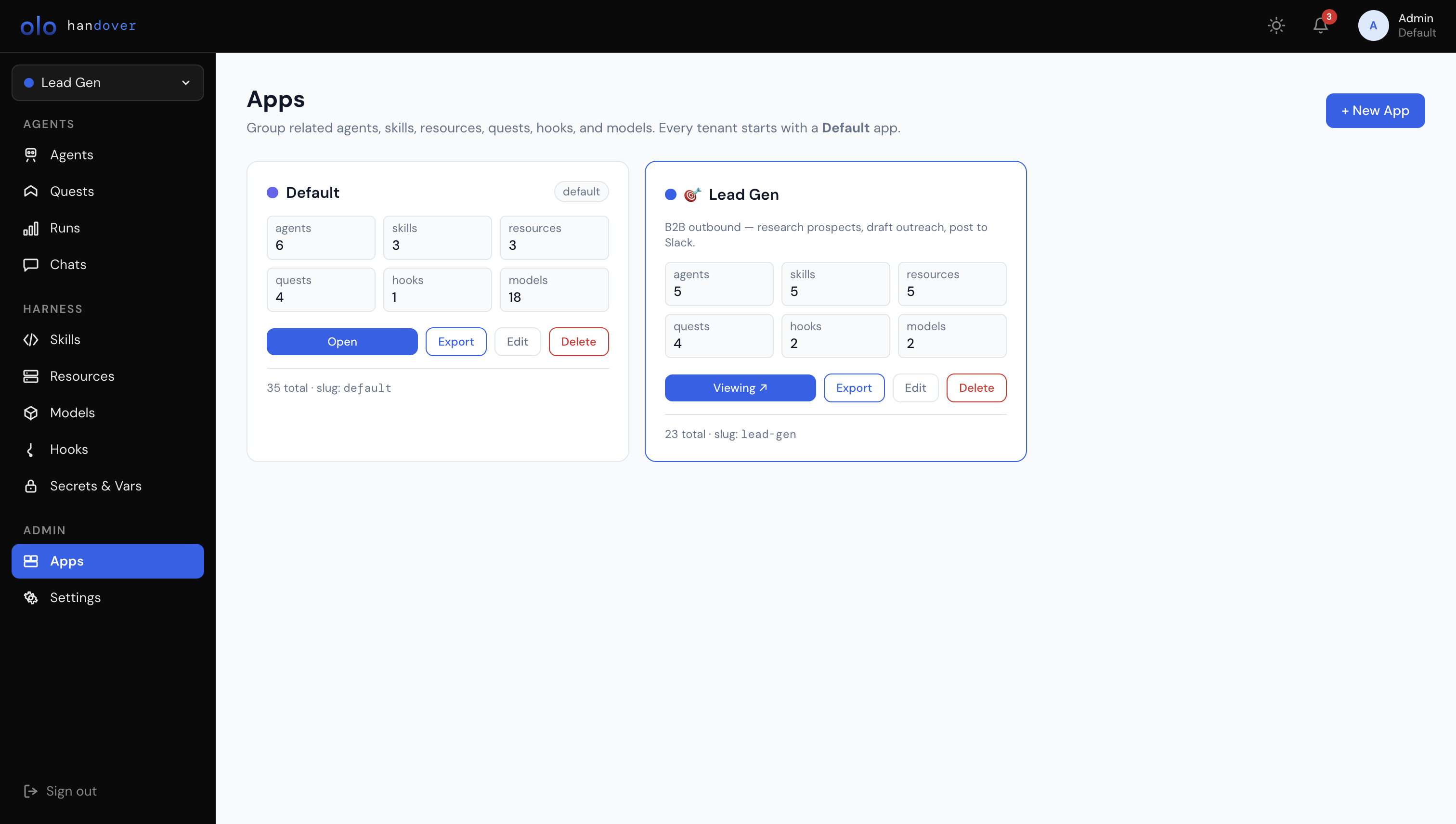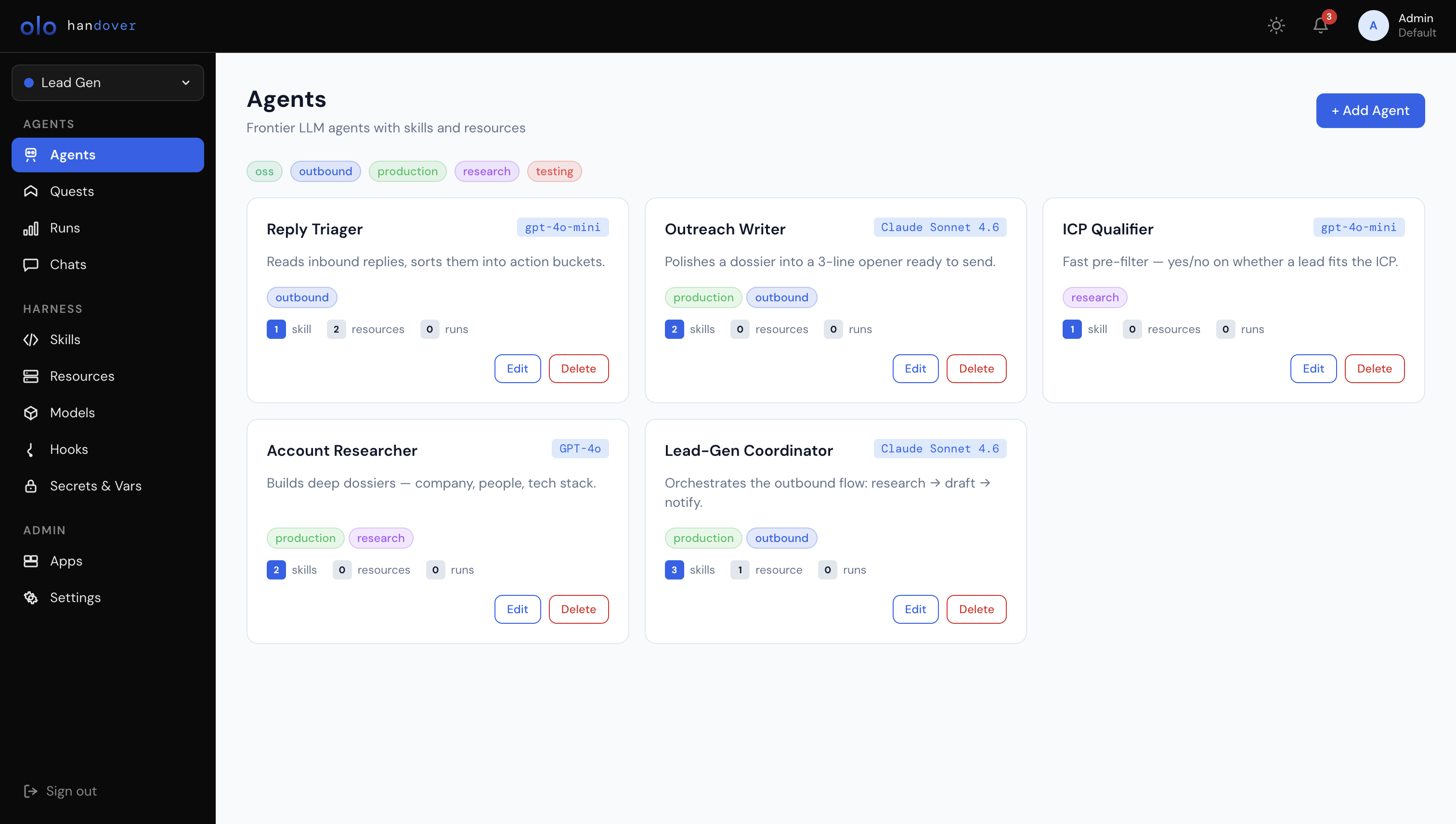Handover is a platform for assembling agentic applications from composable parts: MCP resources, small-LLM skills, frontier agents, lifecycle hooks, scheduled quests. Multi-tenant, your data and credentials stay yours. Currently in private preview.
