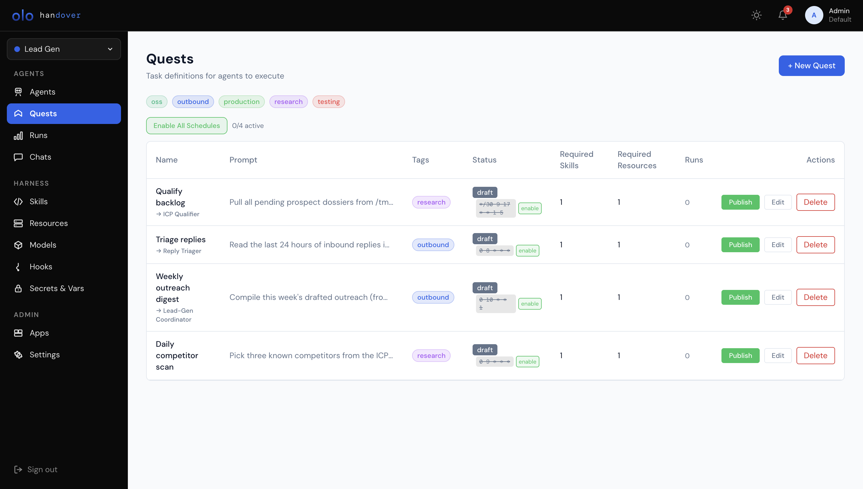 Domain experts who know their problem can compose agentic apps on Handover in an afternoon. Resources reuse across apps, skills compose into agents, hooks chain, quests schedule — when the parts are this composable, building one is mostly choosing. What used to be a six-month roadmap becomes a week’s work, and the next one is even faster.